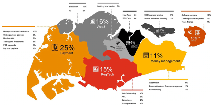 Government-Led Ecosystem Building: Singapore hosts the annual Singapore FinTech Festival, the world’s largest FinTech event, which is a platform for global startups to connect with investors, banks, and regulators. MAS has also established APIX (API Exchange), a global open-innovation platform that allows foreign FinTechs to collaborate with financial institutions in Singapore and the region. To strengthen specific niches, MAS and other agencies fund industry sandboxes – for instance, digital banks (Singapore awarded digital full bank licenses to new entrants, including a consortium involving China’s Ant Group) and blockchain innovation (through the Project Ubin initiative for digital currencies). The result is a comprehensive FinTech hub: Singapore is ranked among the top FinTech hubs globally and attracted over US$4.1 billion in FinTech investment in 2022, the highest in Southeast Asia (FinTech and Innovation – Monetary Authority of Singapore). Below is a Mapping of Singapore’s FinTech ecosystem by sub-sector (2024). Payments (25%) form the largest segment, followed by areas like RegTech (15%), Web3/Blockchain (16%), and wealth management tech (11%). The diverse mix showcases opportunities across the FinTech spectrum, all supported by Singapore’s conducive policies (Fintech market in Singapore).