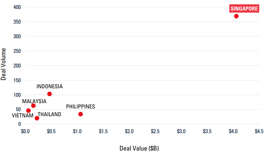 Within ASEAN, Singapore stands out amongst its peers as the top deal making country in the region in both deal volume and deal value.